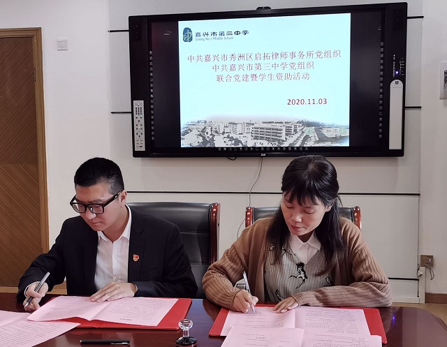 最后,浙江啟拓律師事務所黨支部與嘉興三中理科黨支部簽訂了黨建合作協議,同時浙江啟拓律師事務所、嘉興市教育基金會以及嘉興三中共同簽訂捐贈協議書。通過基層黨組織結對共建活動的開展,實現支部間“優(yōu)勢互補、資源共享、取長補短、共同提高”,創(chuàng)新基層黨建工作載體,提高基層黨建工作水平,開創(chuàng)基層黨建工作新格局。